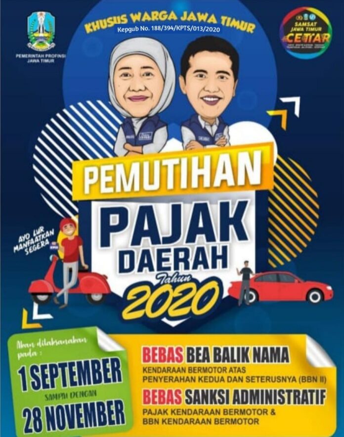 Bukde Khofifah –sapaan akrab Gubernur Jatim melanjutkan kebijakan pemutihan terhadap sanksi administratif PKB dan Bea Balik Nama Kendaraan Bermotor (BBNKB). Pemutihan juga berlaku dalam bentuk pembebasan BBNKB kedua dan seterusnya. Kebijakan ini berlaku mulai 1 September hingga 28 November 2020.