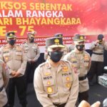 Surabaya – Peringati hari Bhayangkara ke 75, Polda Jawa Timur gelar bakti sosial dalam bentuk pembagian sembako, kepada Masyarakat yang membutuhkan