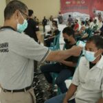 Sidoarjo – Sebanyak 2.000 anggota banser yang ada di Sidoarjo disuntik vaksin Covid-19 di Polresta Sidoarjo, Minggu (11/7/2021). Selain ada dari