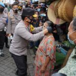 Kapolda Jatim Memakaikan Masker Secara Langsung ke Masyarakat Saat Pembagian Masker di Pasar Simo