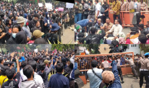 KEDIRI – Aksi bakar spanduk hingga saling dorong dalam aksi unjuk rasa penolakan Undang-Undang Cipta Kerja atau Omnibus Law mengakibatkan pintu gerbang sebelah