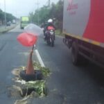 LAMONGAN – Kondisi Ruas Jalan Raya Nasional Babat – Pucuk tepatnya di perbatasan antara desa Warukulon dan Kesambi sangat membahayakan bagi pengendara