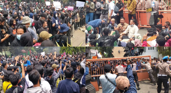 KEDIRI – Aksi bakar spanduk hingga saling dorong dalam aksi unjuk rasa penolakan Undang-Undang Cipta Kerja atau Omnibus Law mengakibatkan pintu gerbang sebelah