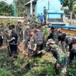 LAMONGAN – Ratusan anggota TNI jajaran Kodim 0812 Lamongan bahu membahu bekerja bakti membersihkan saluran irigasi di pintu air aliran sungai di