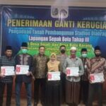 SAMPANG – H Slamet Junaidi selaku Bupati Sampang Madura Jawa Timur menyerahkan dana ganti kerugian Pembangunan Stadion yang ke III Penyerahan secara