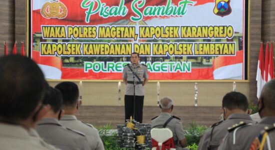 MAGETAN – Kapolres Magetan AKBP Festo Ari Permana memimpin langsung upacara serah terima jabatan (Sertijab) Wakapolres, dan Kapolsek jajaran di halaman Mapolres,
