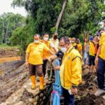 SURABAYA – Ketua DPD Partai Golkar Jatim M. Sarmuji melihat dari dekat kondisi tanggul yang jebol dan menemui warga di desa